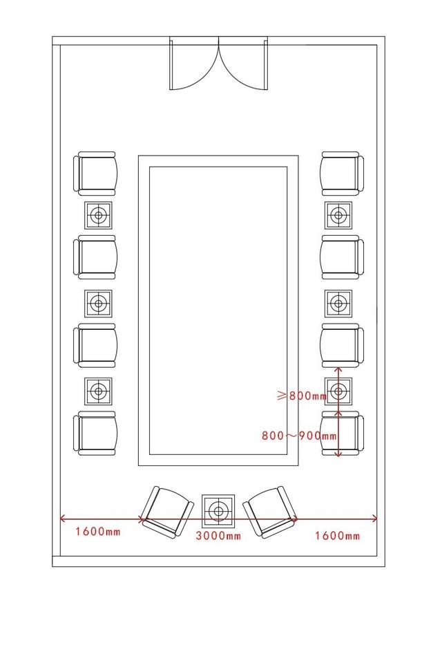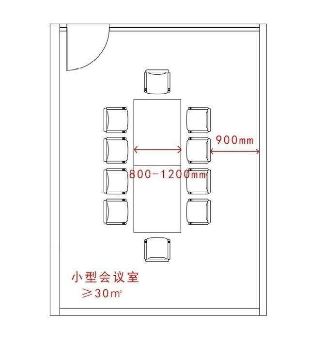 6.4.3 小型會(huì)議室面積不宜小于30㎡可供15人會(huì)議;小型會(huì)議室會(huì)議桌為:桌面寬度0.8m~1.2m,桌子高度0.75m~0.8m;椅子與墻面的中間過道不應(yīng)少0.9m。
