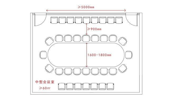 6.4.4 中型會(huì)議室面積不宜小于60㎡、可供15~50人會(huì)議;中型會(huì)議室的會(huì)議桌桌面尺寸為1.6m~1.8m;桌子高度0.75m~0.8m;如該辦公室位于高層建筑的內(nèi),依據(jù)《高層民用建筑設(shè)計(jì)防火規(guī)范》規(guī)定,達(dá)到60平方的獨(dú)立開間需設(shè)計(jì)兩個(gè)以上的安全疏散出口,其相鄰兩個(gè)安全出口最近邊緣的水平距離不應(yīng)小于5m。