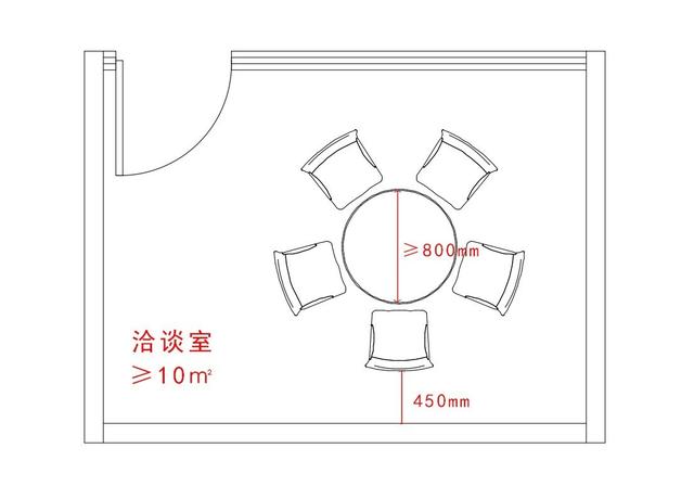 6.6.1 洽談室是簡(jiǎn)短交談、快速接待使用的功能室,洽談室一般為封閉性,談話有一定的私密性。洽談室的面積不應(yīng)小于10平方,可容納3~5人交談。