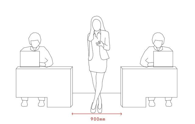 6.2.1 辦公室的通道尺寸不應(yīng)少于0.9m,滿足兩個(gè)人正面和側(cè)面同時(shí)通過。