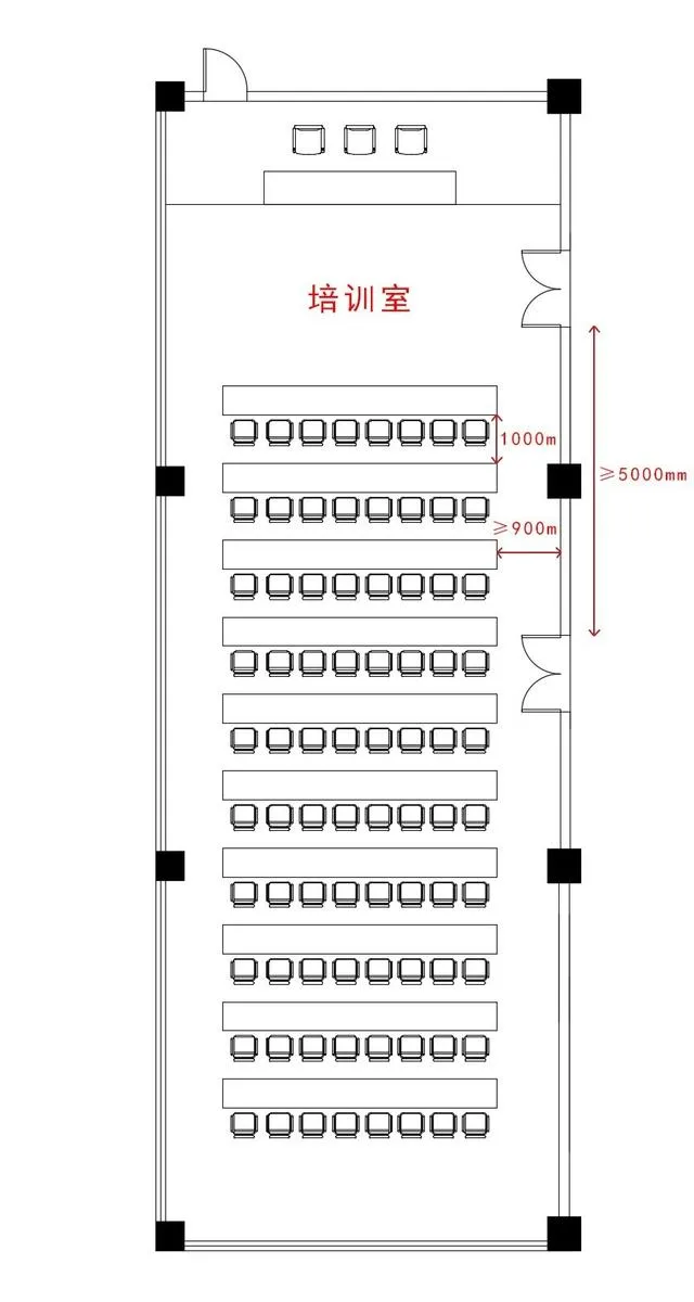 6.4.5 培訓(xùn)室前后桌子的距離應(yīng)不小于0.9m~1m;椅子與墻面的中間過道不應(yīng)少0.9m。培訓(xùn)桌桌面寬度為0.4m~0.6m ,桌子高度為0.7m~0.8。依據(jù)建筑設(shè)計(jì)防火規(guī)范規(guī)定,達(dá)到60平方的獨(dú)立開間需設(shè)計(jì)兩個(gè)以上的安全疏散出口,其相鄰兩個(gè)安全出口最近邊緣的水平距離不應(yīng)小于5m。超60平方的培訓(xùn)室墻面飾面應(yīng)設(shè)計(jì)吸音板材。