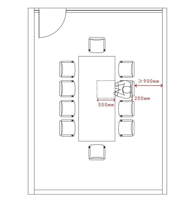 6.4.6 單個(gè)空間尺寸 :椅子左右分隔尺寸宜為0.2m,會(huì)議桌的活動(dòng)范圍為0.5m,椅子與墻面的中間過道不應(yīng)少0.9m。