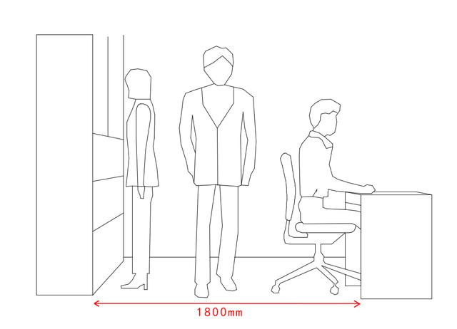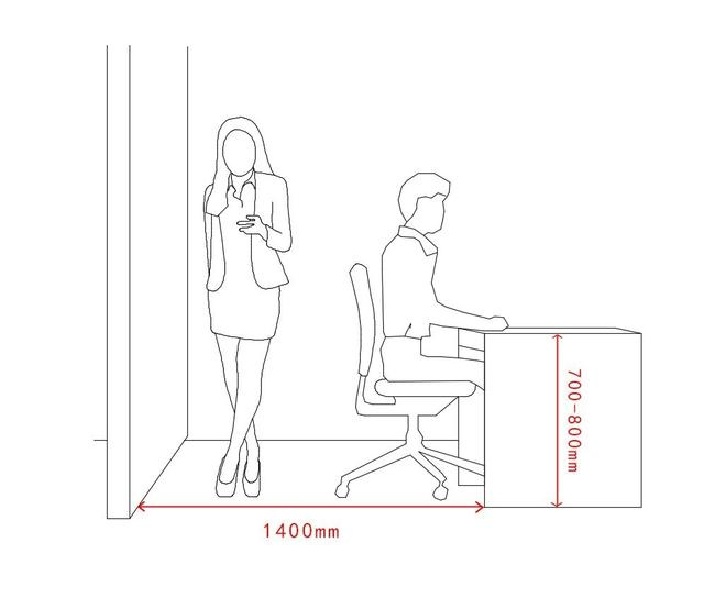 6.1.3 前臺(tái)員工活動(dòng)后方距離墻體或物體需預(yù)留不少于0.9m通道。