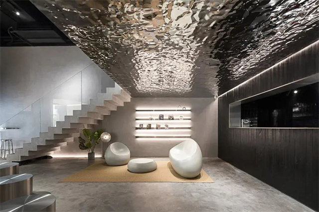 “水波紋板”顧名思義就是表面紋理類似水波蕩漾,裝飾性極強(qiáng)一種板材。作為吊頂?shù)葏^(qū)域的點(diǎn)綴裝飾,不銹鋼的特殊材質(zhì)使得空間從視覺(jué)上層次更豐富。